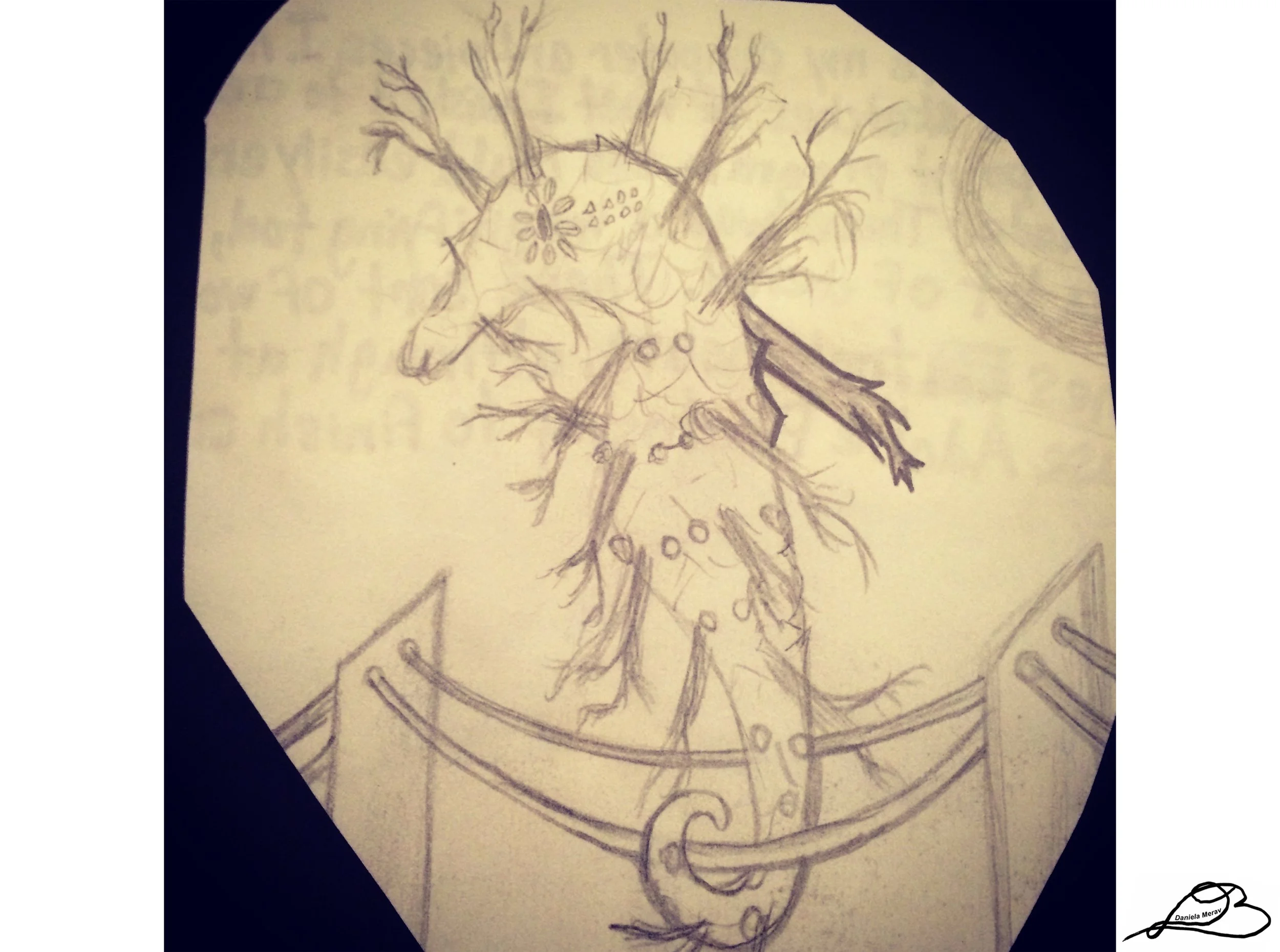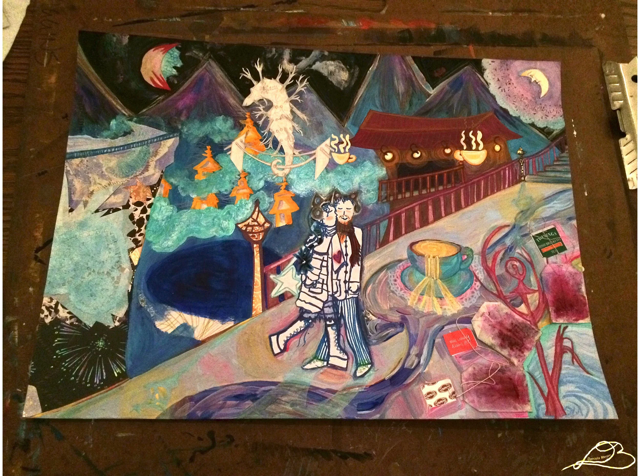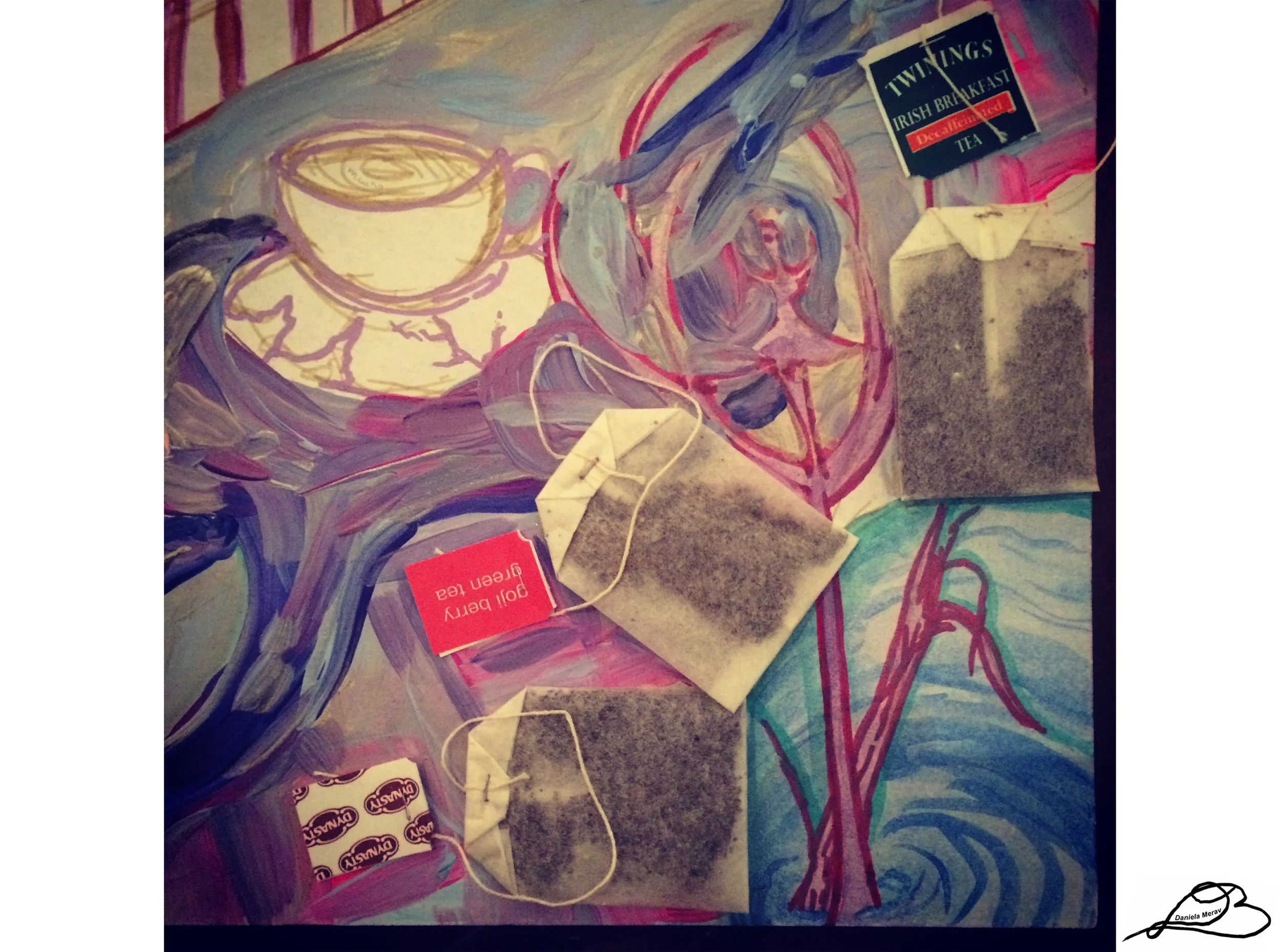 Collage, glue, paper, teabags, doilies, watercolor, acrylic paint, markers, pencil on poster board